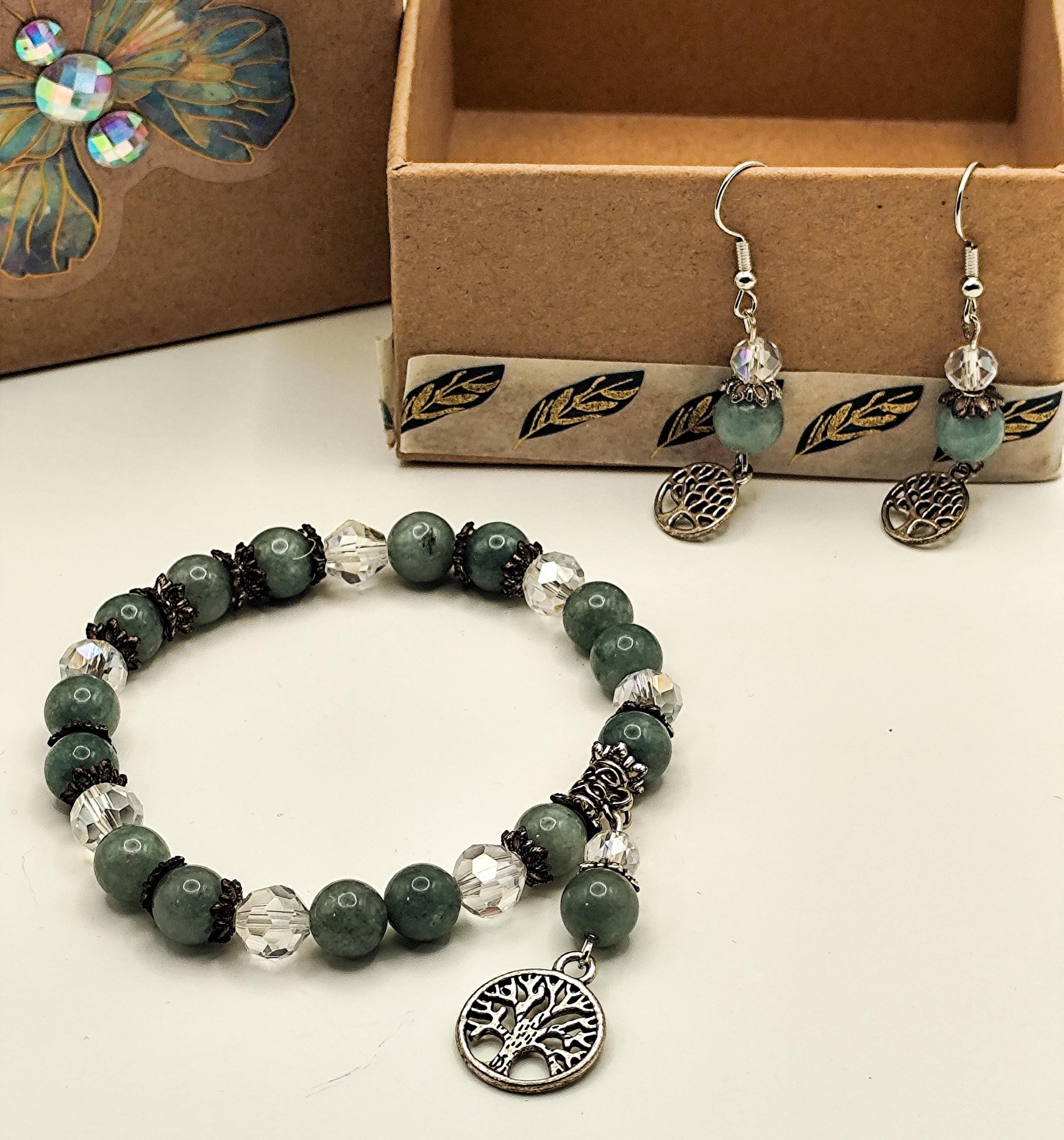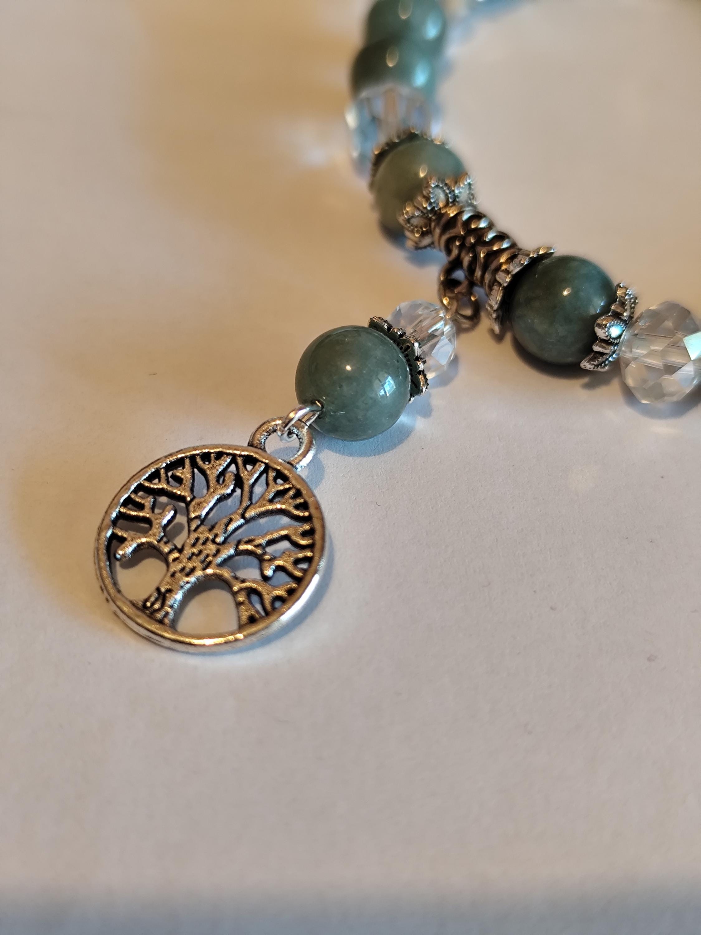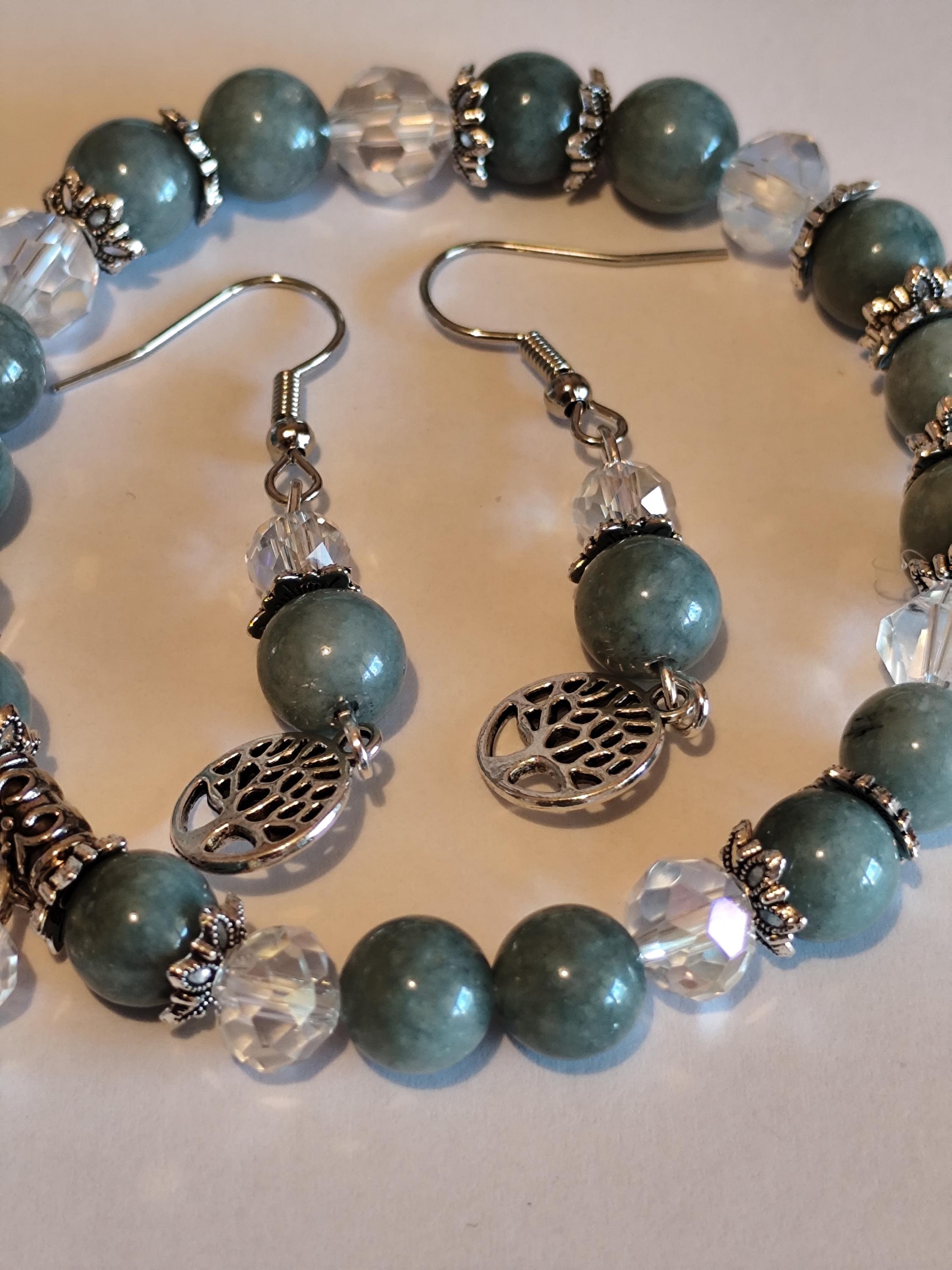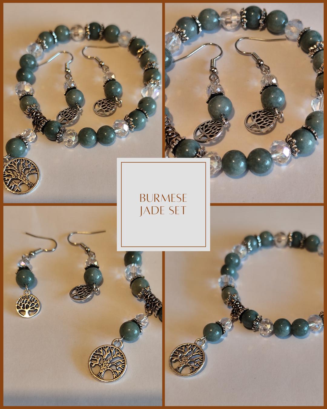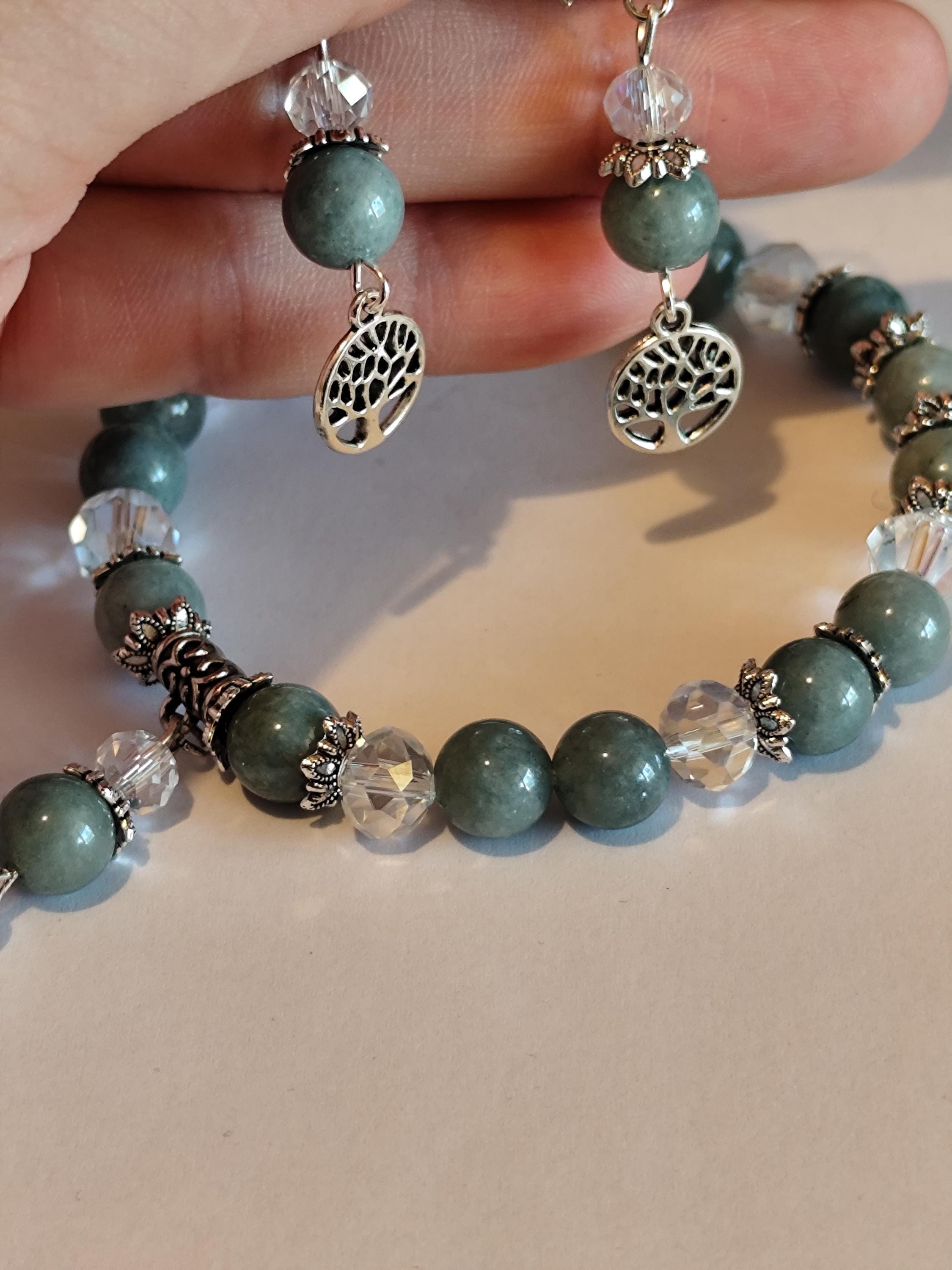 This enchanted jewelry set features Burmese jade — a stone of deep serenity, harmony, and ancient protection. Clear faceted beads shimmer like captured starlight, while the Tree of Life charm anchors you to your roots and reminds you of your soul's growth.