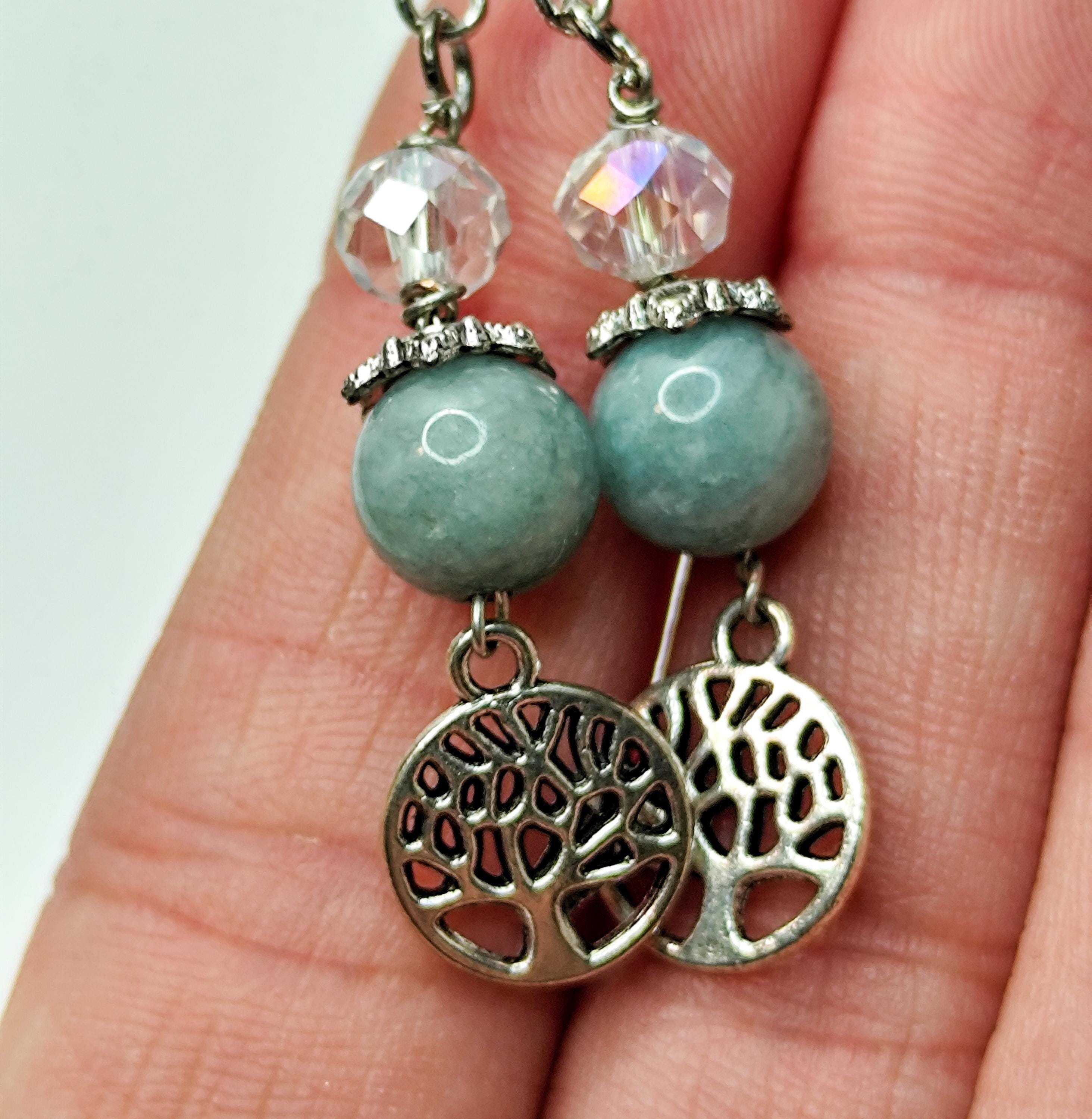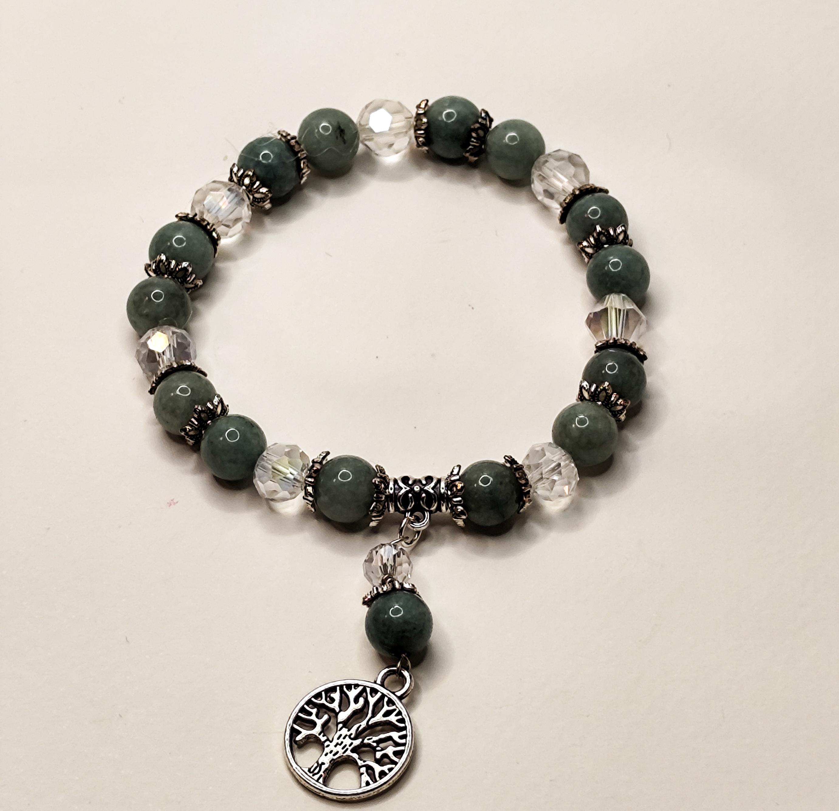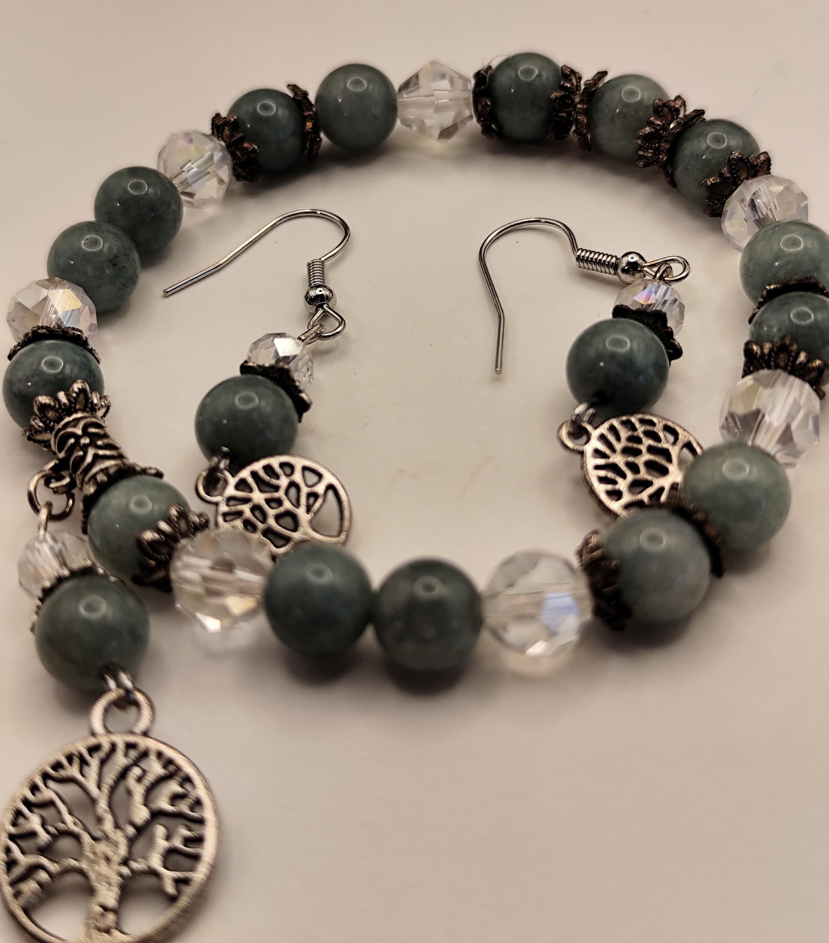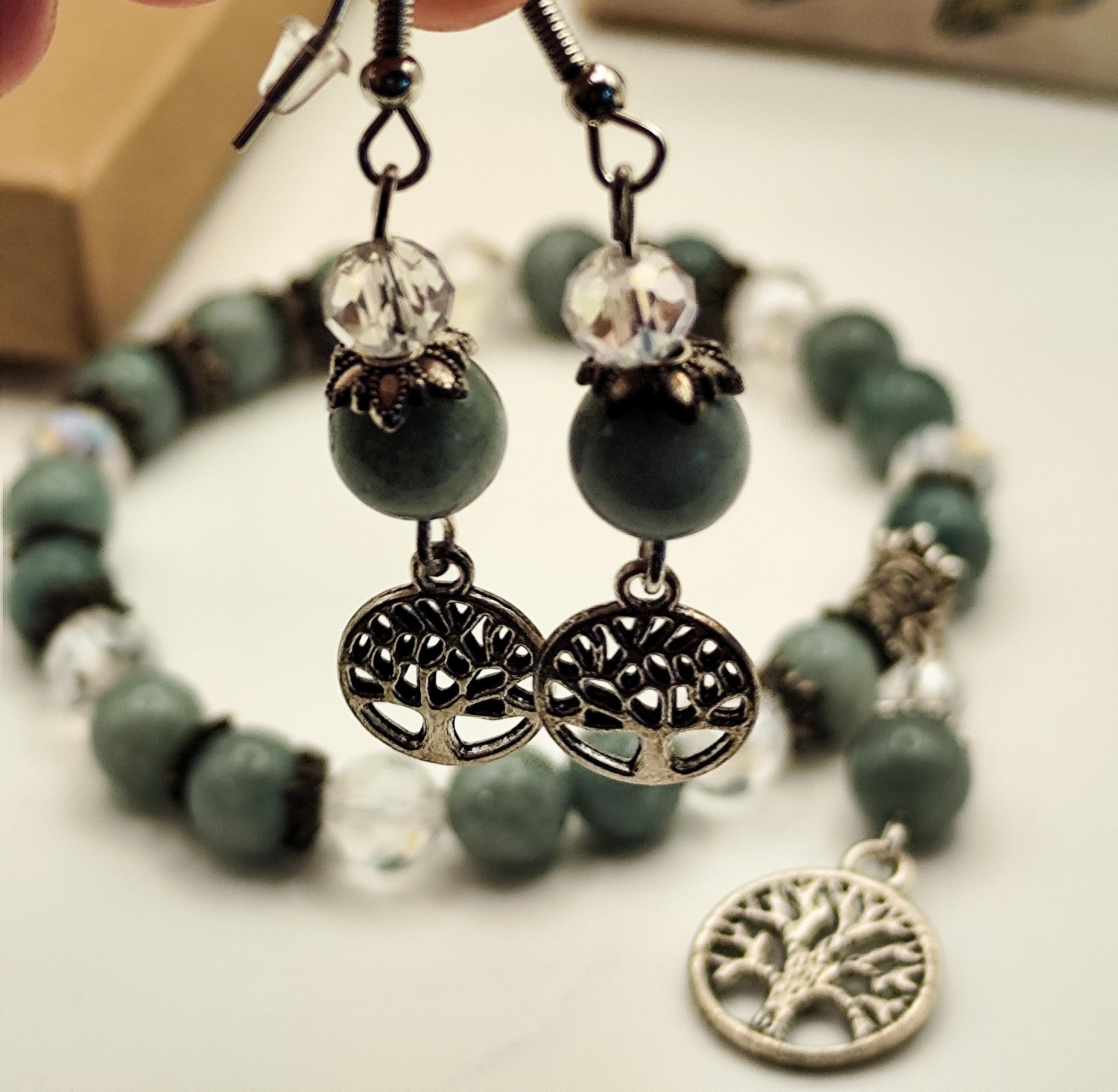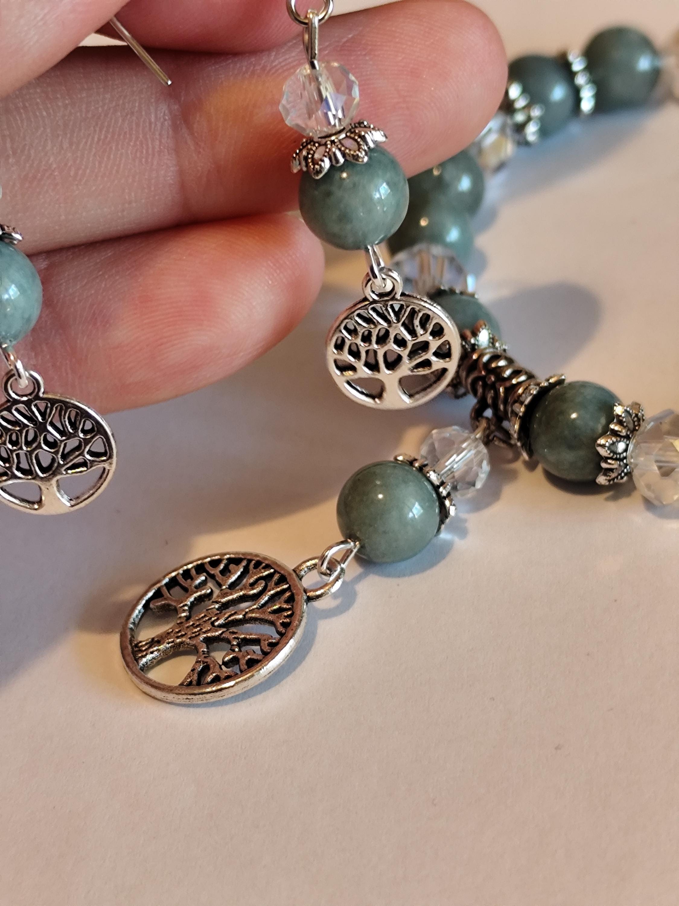 This enchanted jewelry set features Burmese jade — a stone of deep serenity, harmony, and ancient protection. Clear faceted beads shimmer like captured starlight, while the Tree of Life charm anchors you to your roots and reminds you of your soul's growth.