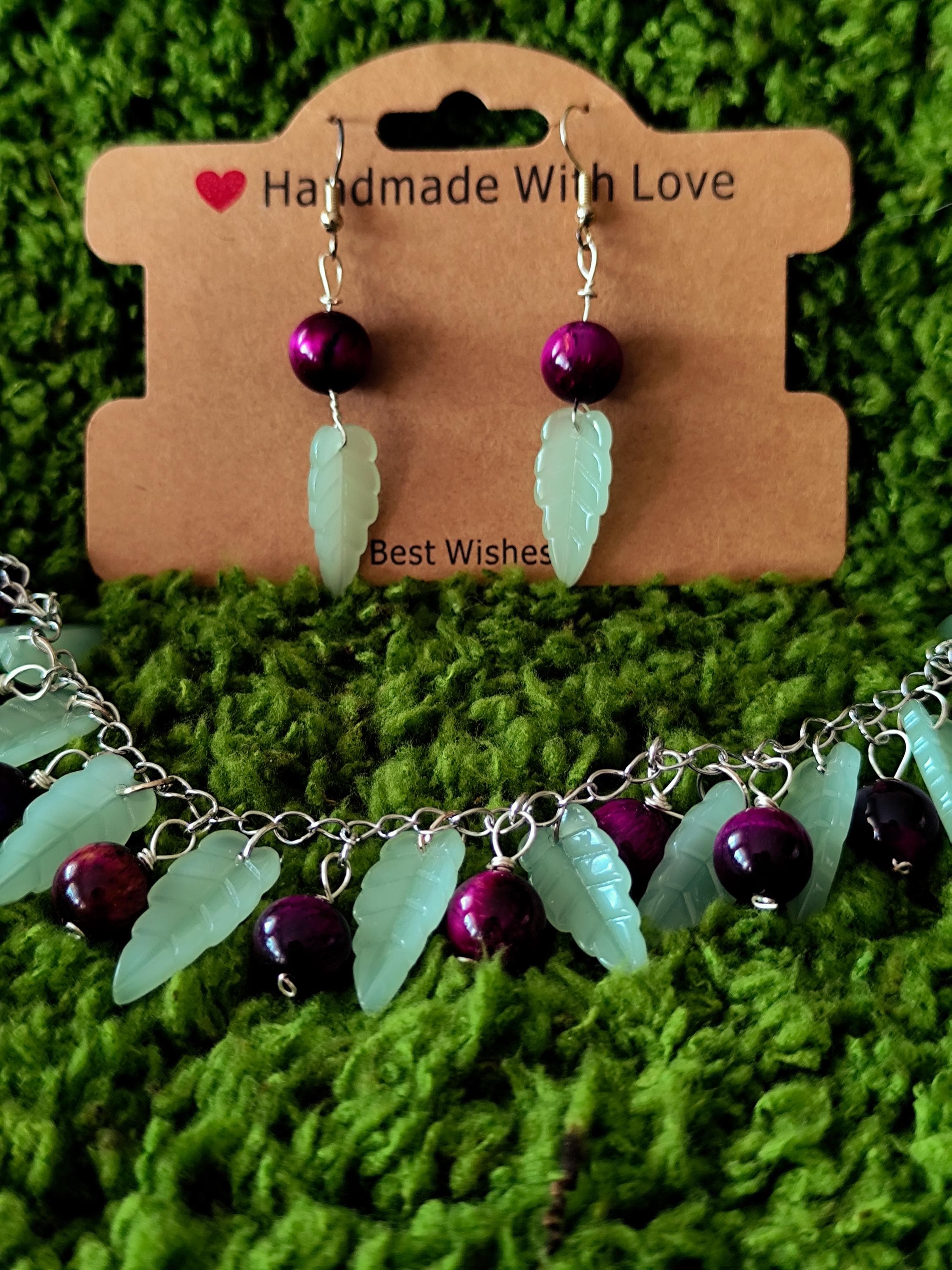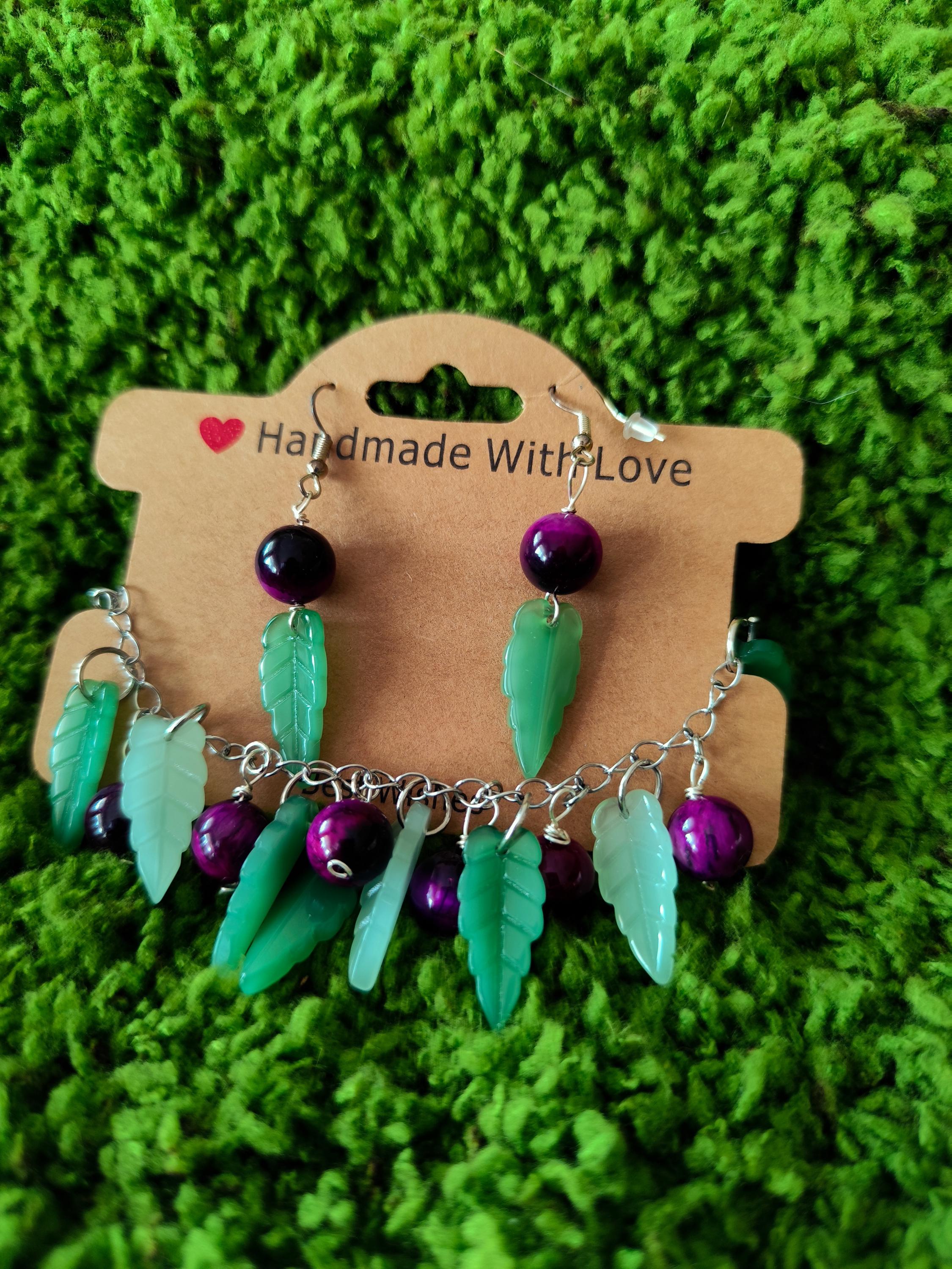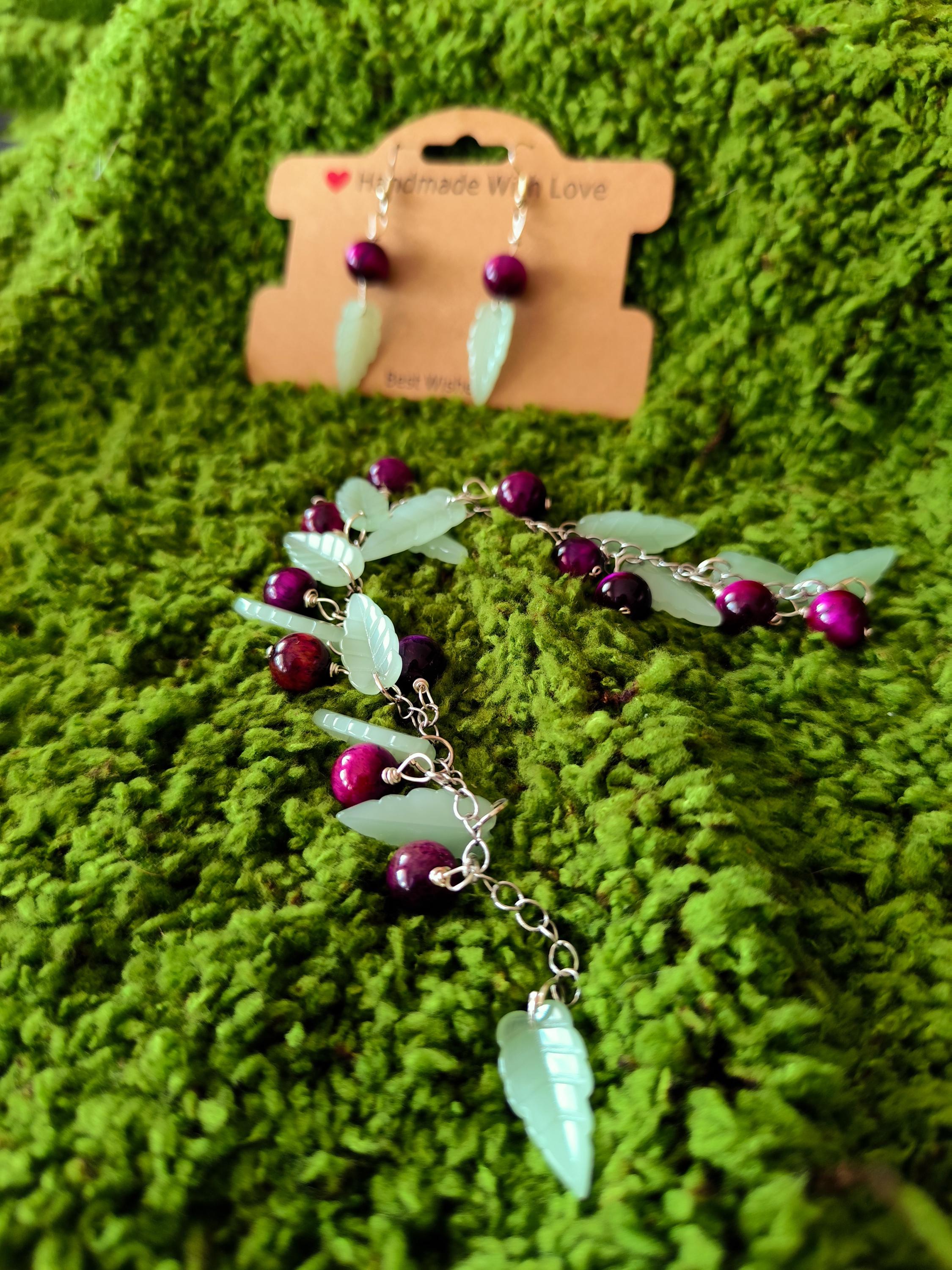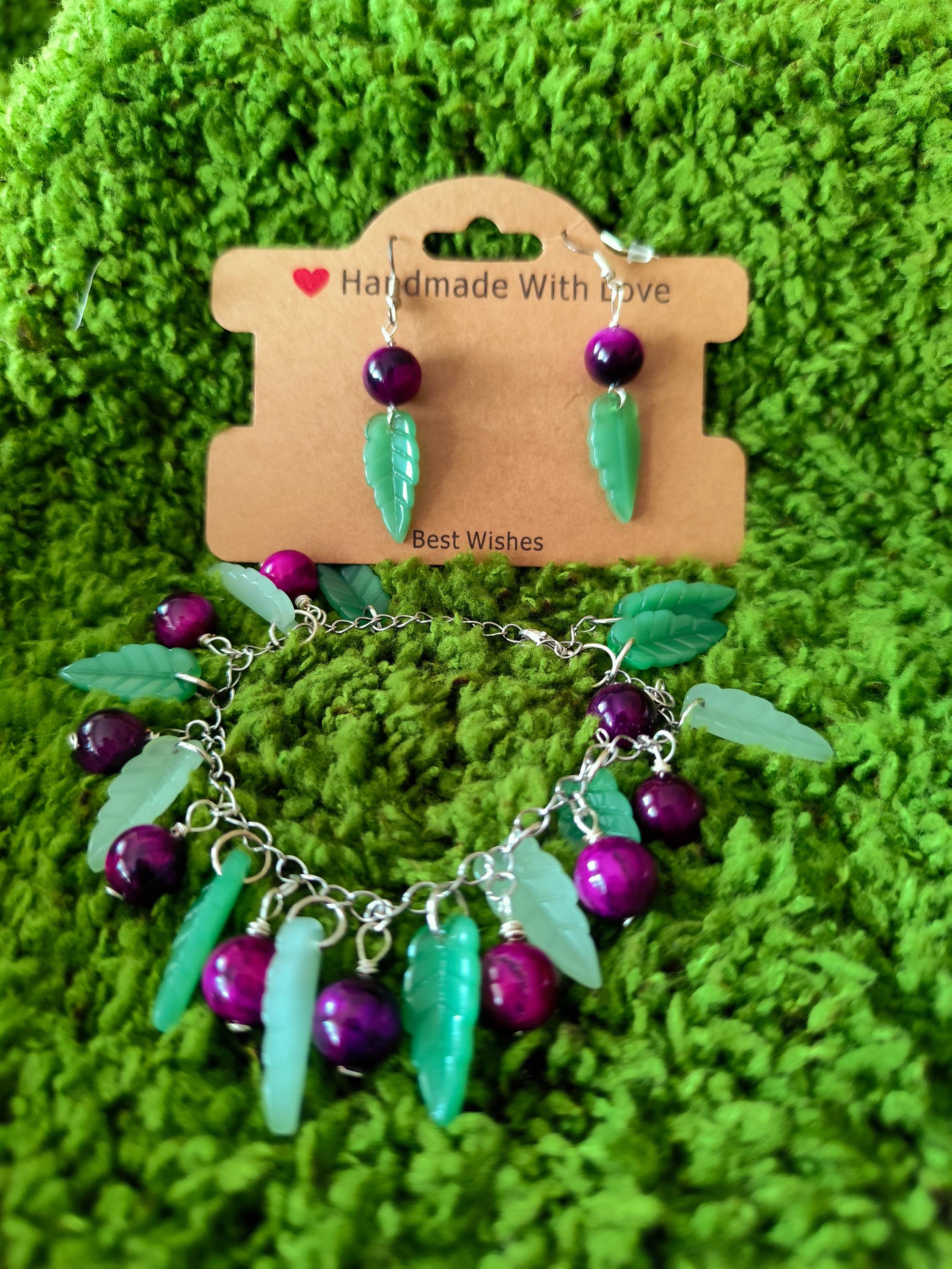 Contains handmade bracelet and earrings Tiger eye natural stones, big glass leaves, stainless steel.