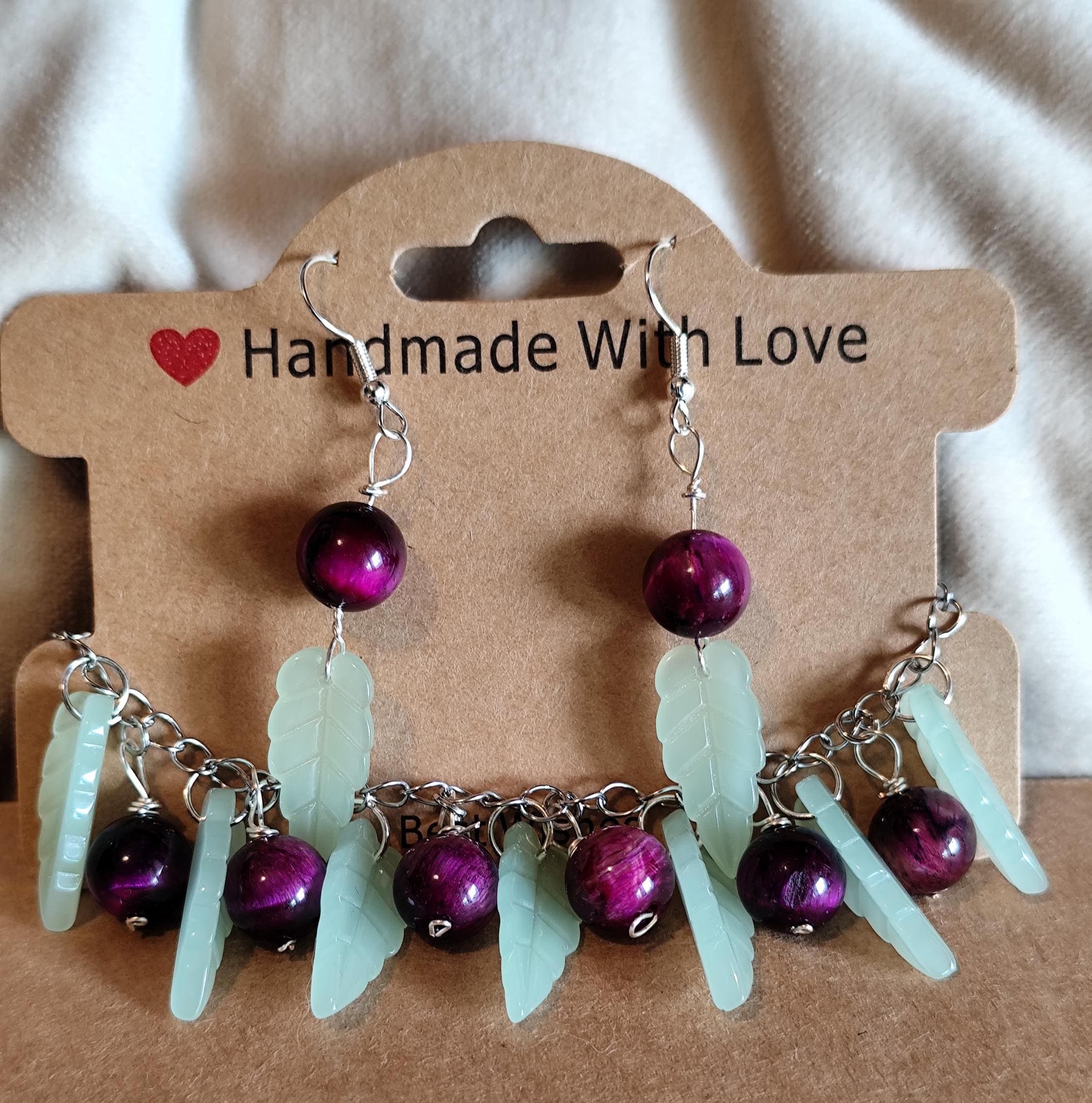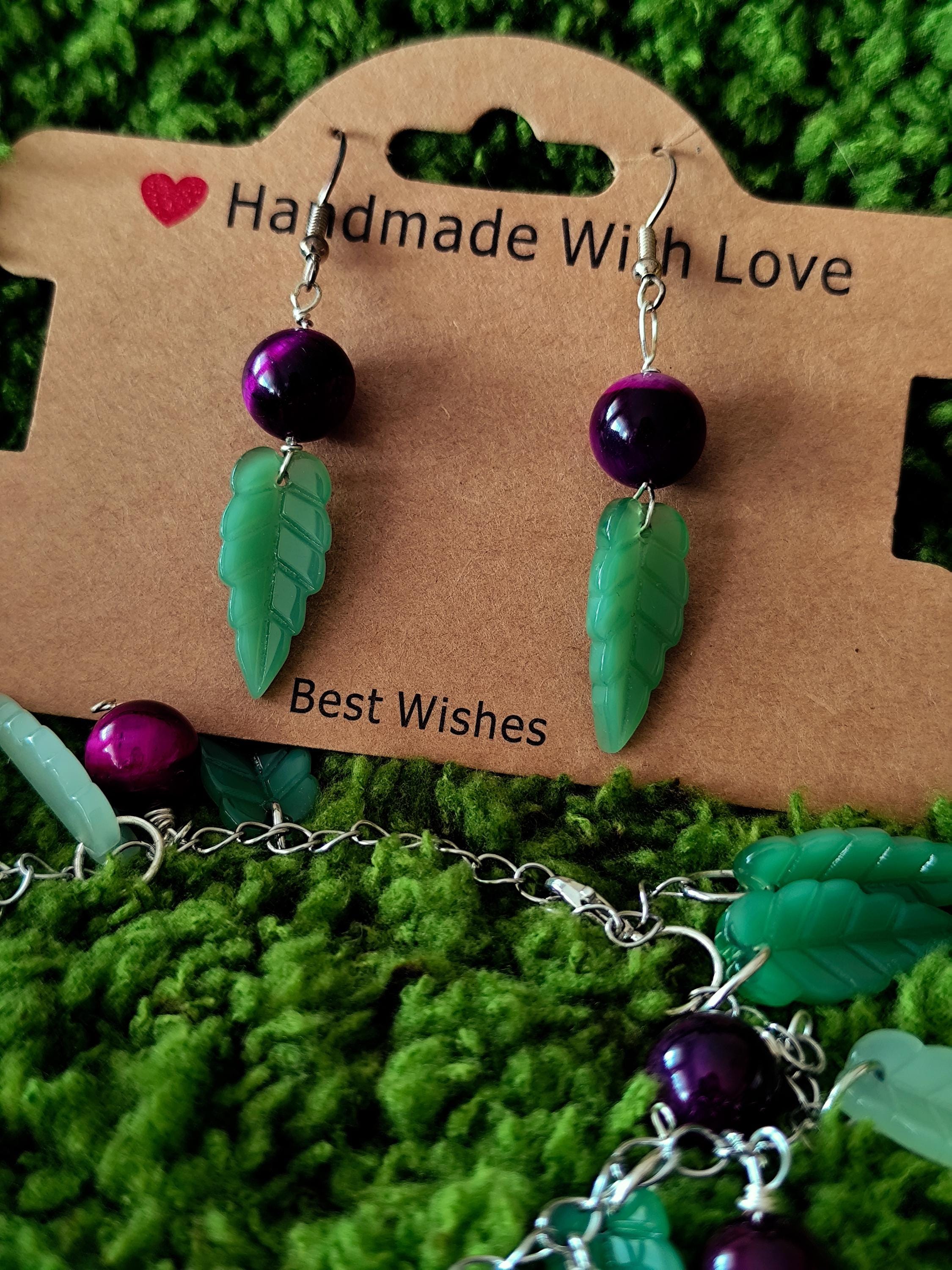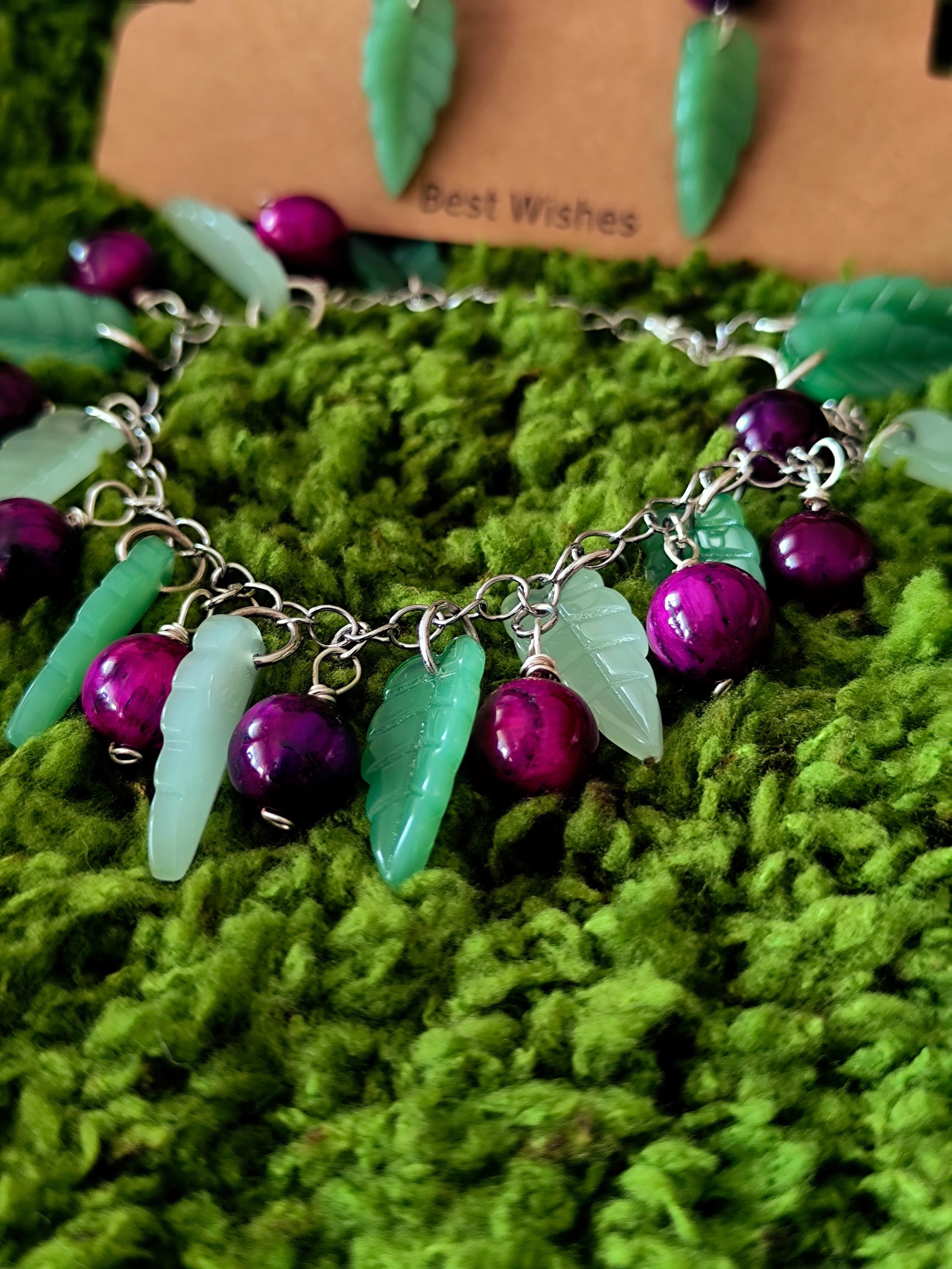 Contains handmade bracelet and earrings Tiger eye natural stones, big glass leaves, stainless steel.