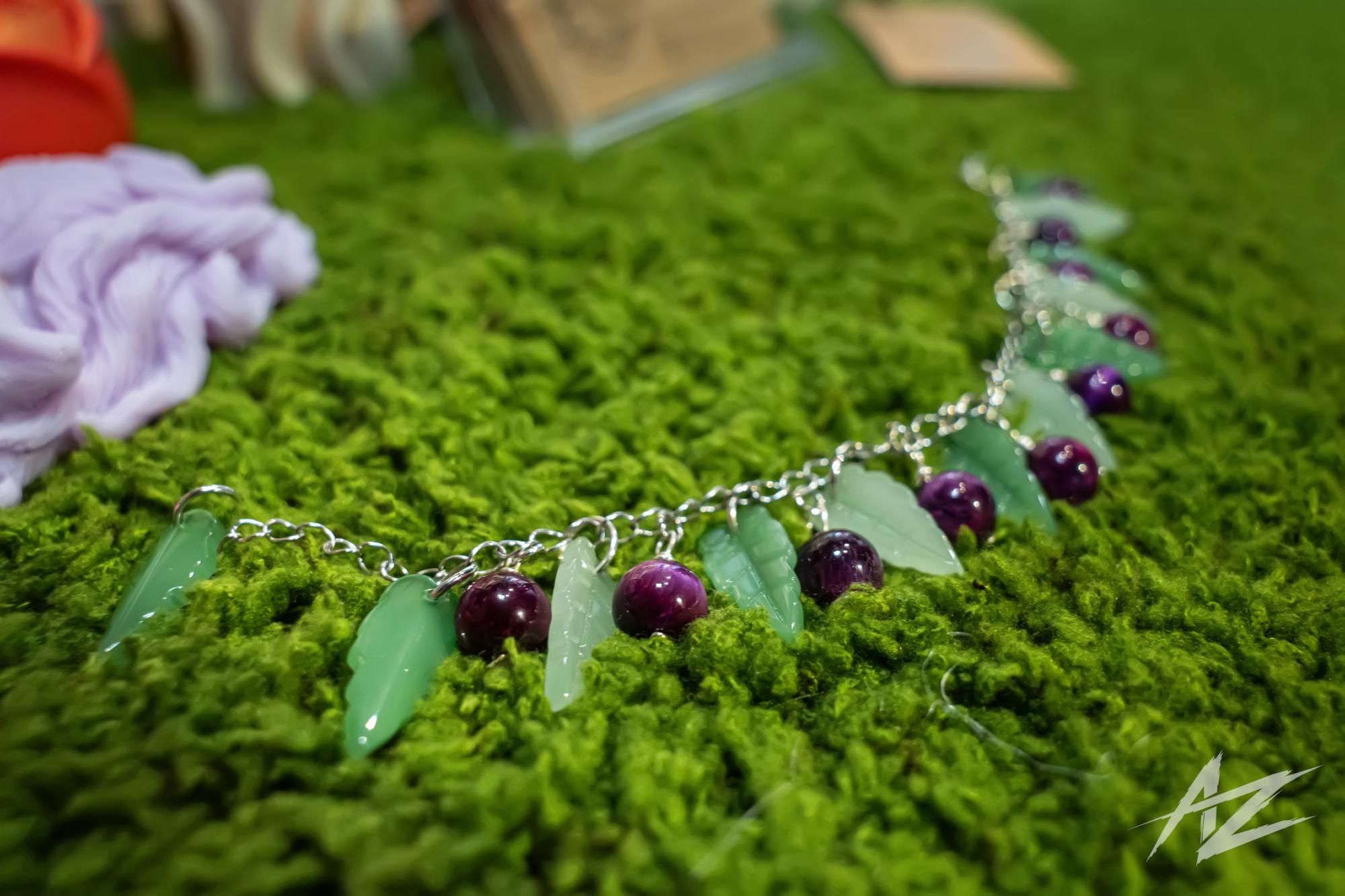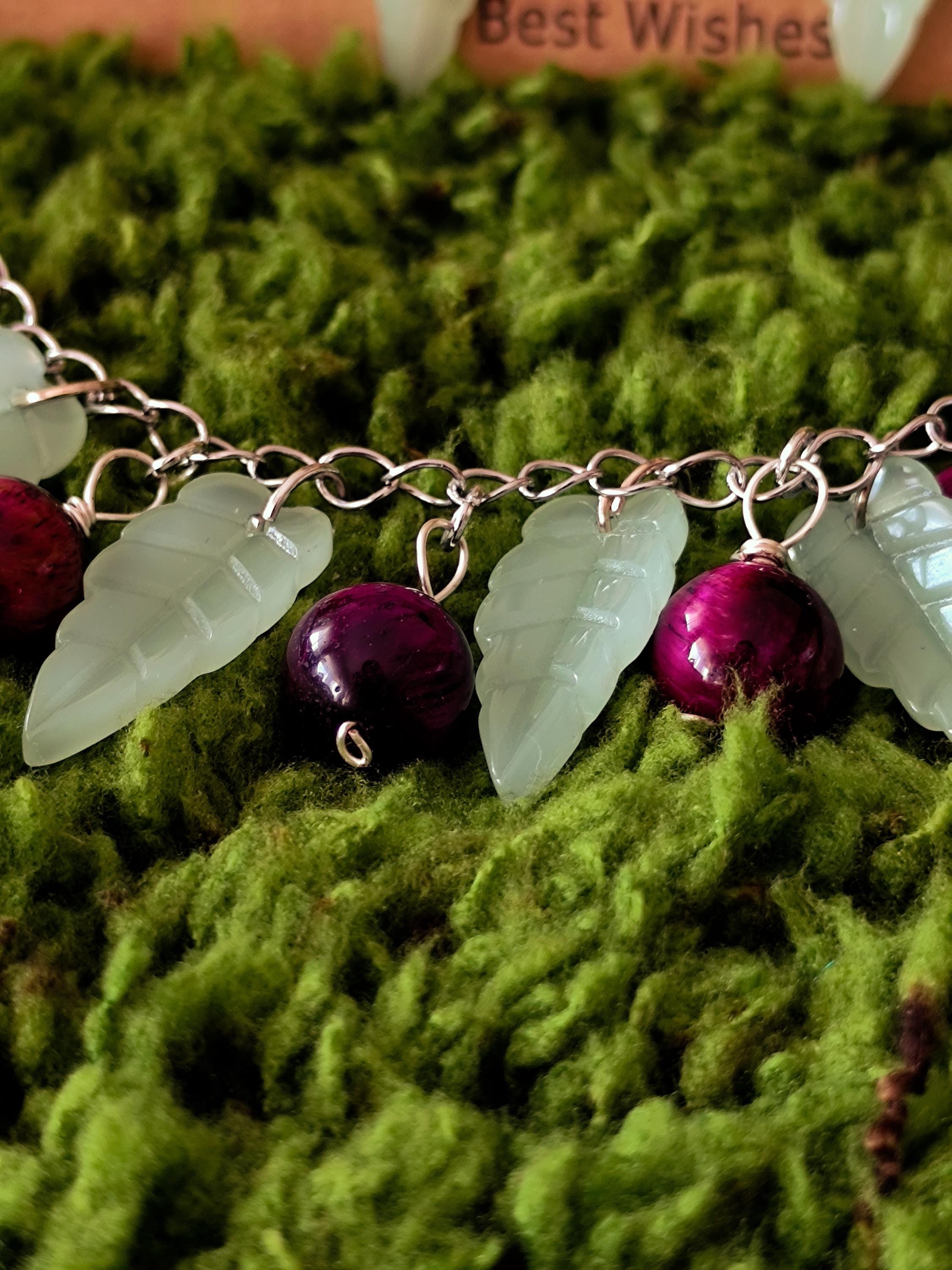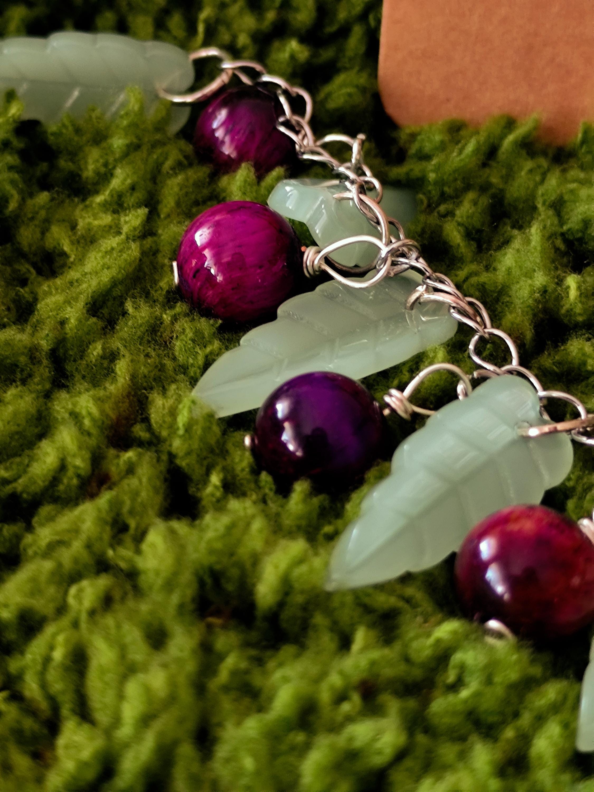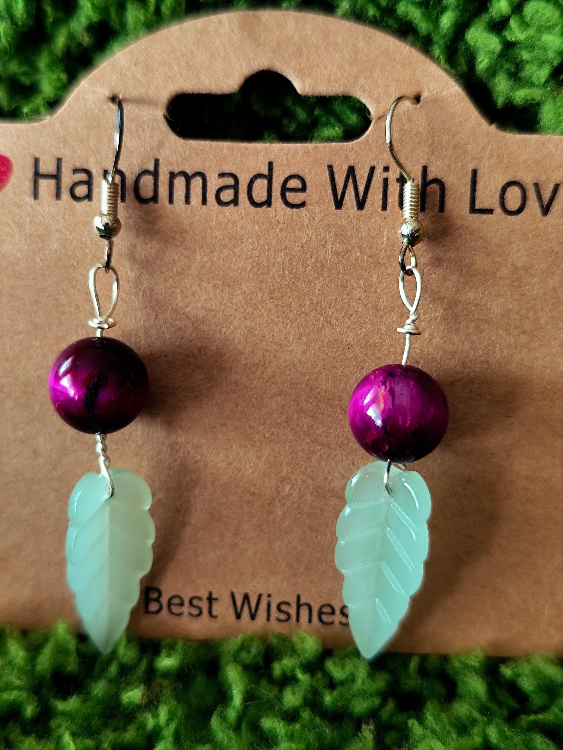 Contains handmade bracelet and earrings Tiger eye natural stones, big glass leaves, stainless steel.